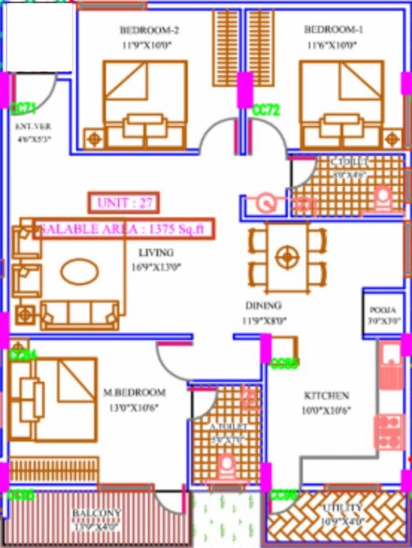 | 3 BHK 1375 Sq. Ft. Apartment | 1375 Sq. Ft.(Saleable) |