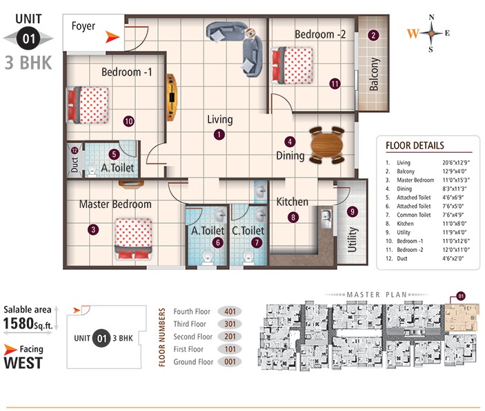 | 3 BHK 1580 Sq. Ft. Apartment | 1580 Sq. Ft.(Saleable) |