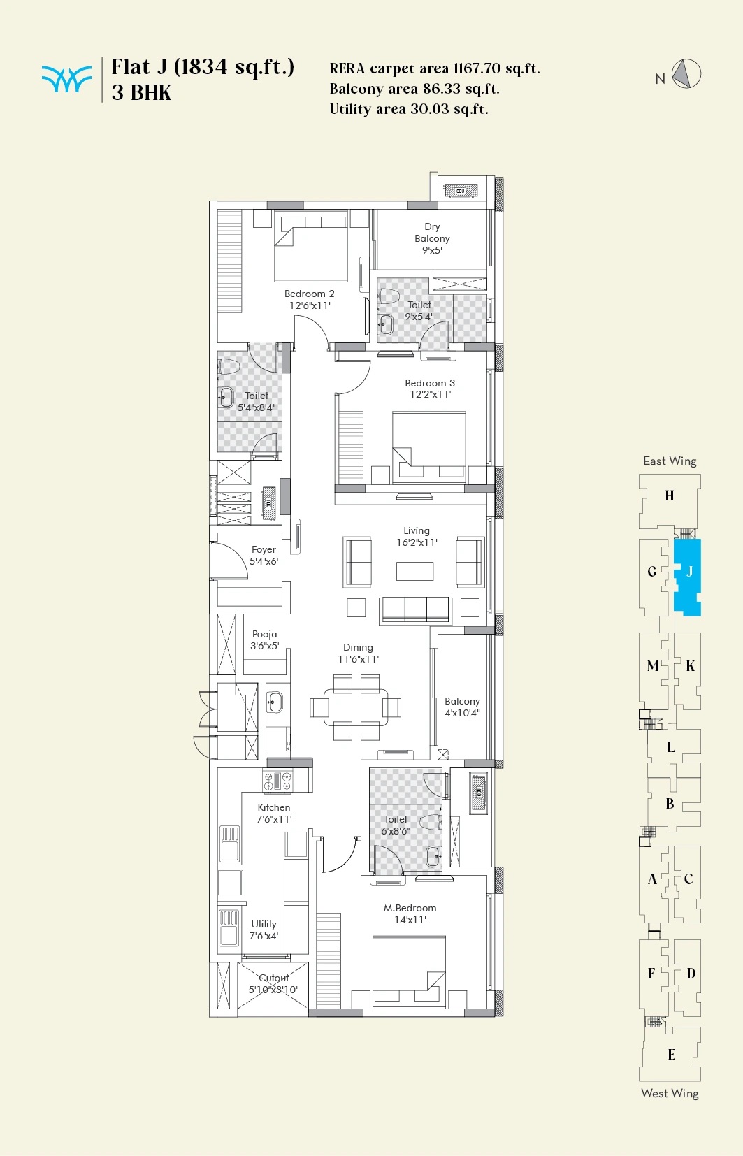 | 3 BHK 1834 Sq. Ft. Apartment | 1834 Sq. Ft.(Saleable) |