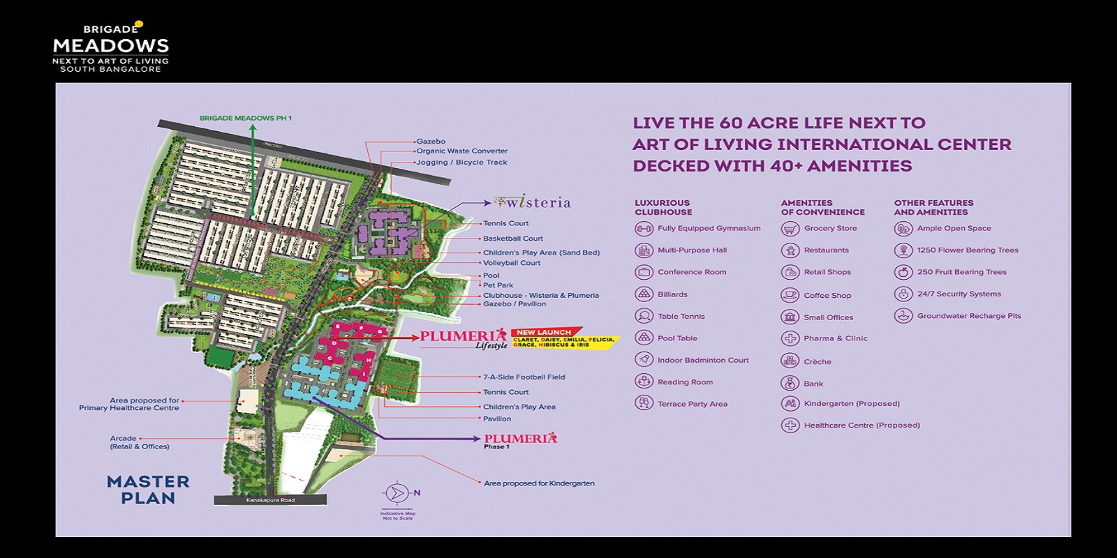 Brigade Meadows Plumeria is a luxurious township that offers 800 units spread over 60 acres in South Bangalore,Bangalore. The township is an integral part of a magnificent 60 acre township next to Art of Living on Kanakapura Road. Brigade Meadows Plumeria offers luxury apartments in 1110 sqft to 1630 sqft. The township also has a commercial complex, creche, 30 bed healthcare centre and shopping arcade.