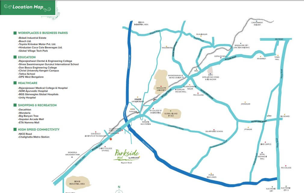 Brigade Parkside West, Bangalore is an upcoming township project located in West Bangalore, Bangalore. It offers 292 units spread over 5 acres and 1 BHK to 2 BHK residences. The project is ideally situated on Mysore Main Road, close to Rajarajeswari College of Engineering. The township is well connected to NICE Peripheral Ring Road.