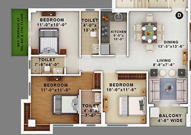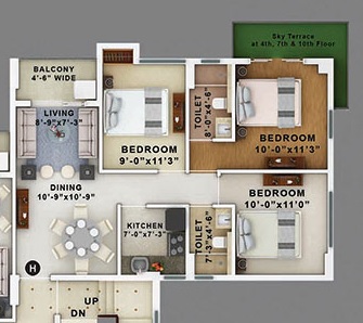 | 3 BHK 1131 Sq. Ft. Apartment | 3 Bedrooms + 2 Bathrooms + 1 Kitchen | ₹ . Ft. |