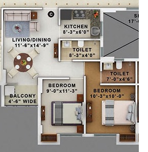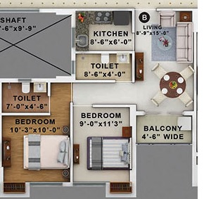 | 2 BHK 856 Sq. Ft. Apartment | 2 Bedrooms + 2 Bathrooms + 1 Kitchen | ₹ . Ft. |