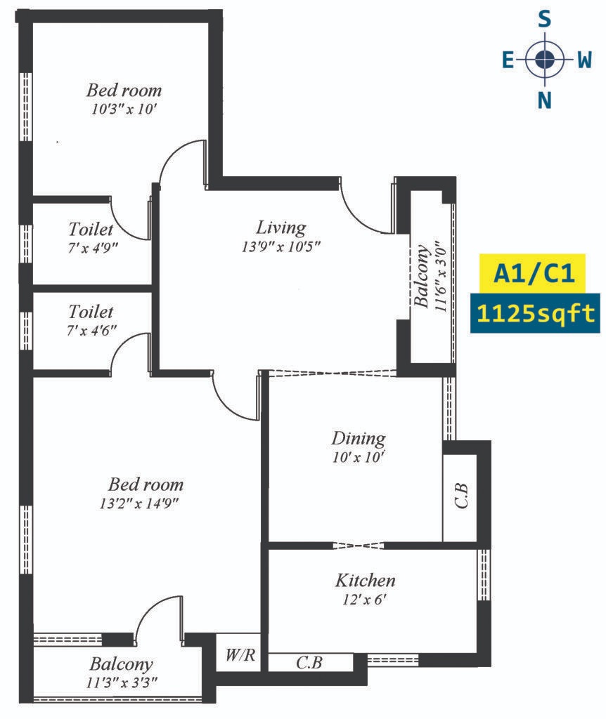 | 2 BHK 1125 Sq. Ft. Apartment | 1125 Sq. Ft.(Saleable) |