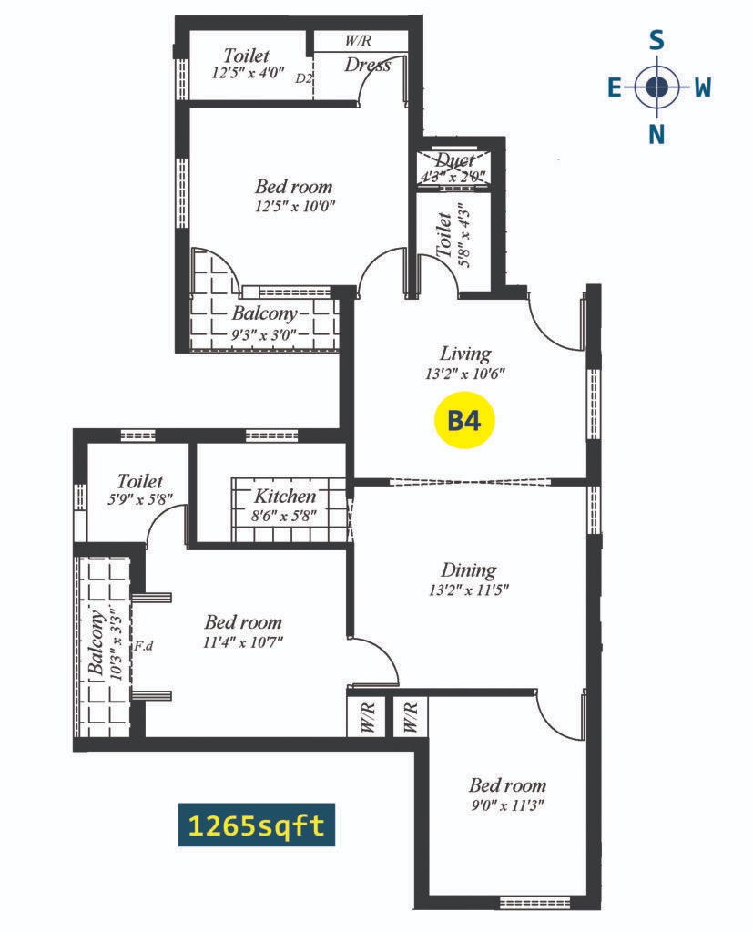 | 3 BHK 1265 Sq. Ft. Apartment | 1265 Sq. Ft.(Saleable) |