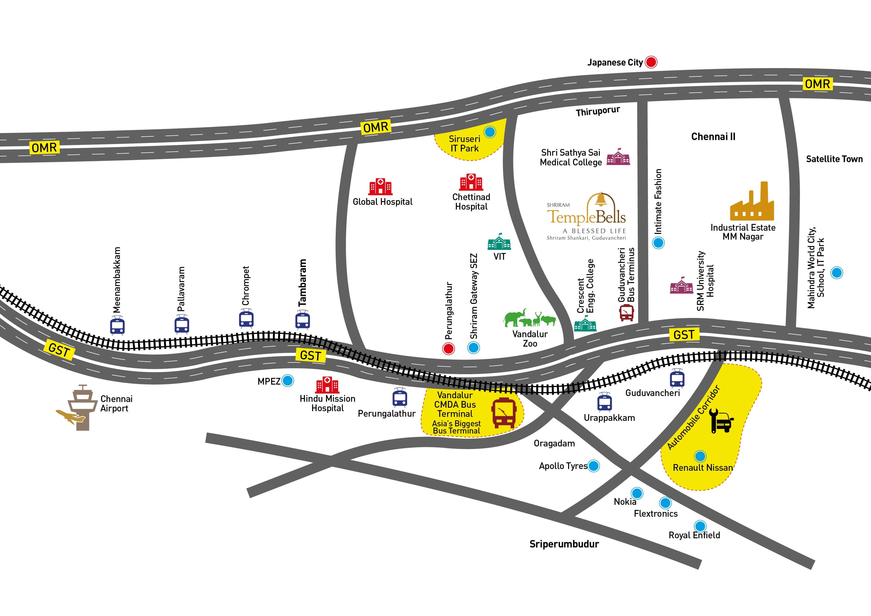 Shriram Temple Bells is a new project by Shriram Group and is located in the suburbs of Chennai, in a lush green environment. The project offers 2BHK-3BHK apartments with sizes ranging from 1190 sqft to 1640 sqft. The project offers excellent amenities such as a large selection of sports, green and open area, and a tranquil atmosphere. The project is also close to various educational institutions and workplaces.