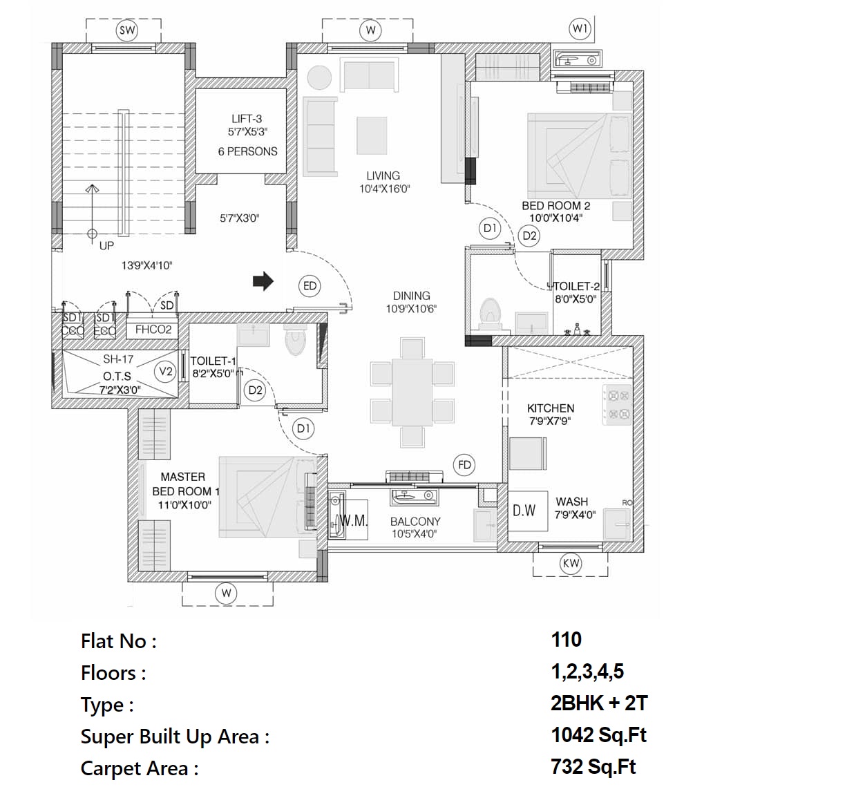 | 2 BHK 1042 Sq. Ft. Apartment | 732 Sq. Ft.(Saleable) |