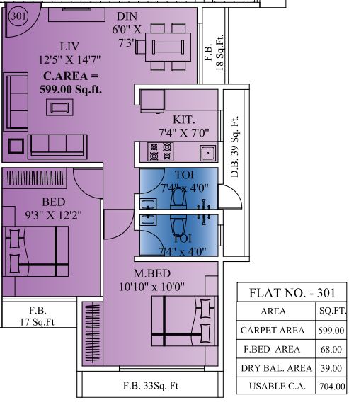 | 2 BHK 599 Sq. Ft. Apartment | 599 Sq. Ft.(Carpet) |